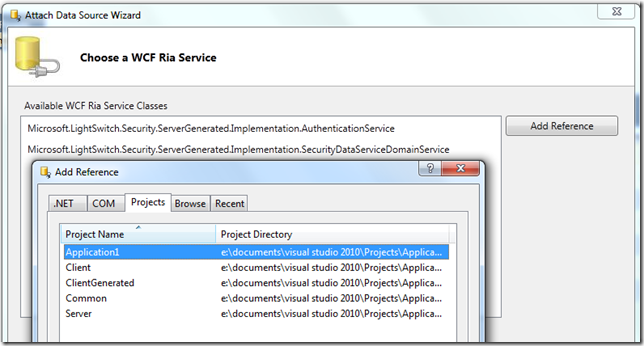 顺带说一下,导入外部数据源的时候,如果选择WCF RIA Services,暂时只能选择到AuthenticationService和SecurityDataService,单点“Add Reference”的时候,你就会看到其他的项目名称了,如: