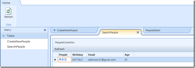 在添加了CreateNew、Search和Details的操作界面后,我们就可以来按F5运行我们的程序的,除了Age计算字段外的一句话,就没有再写代码了,运行效果如下: