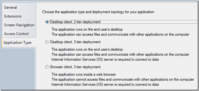 大家注意,第一个选项是Desktop Client,且是只有2层,Silverlight的Client和SQL Server的Data,那么就是说LightSwitch为Silverlight提供了直接(或通过某种包装器)访问数据库的能力(中间应该还是EF)。
