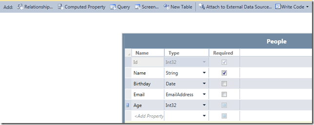 可以说,在LightSwitch中Table是一切的核心,也是一切的启动,可以从工具条的操作按钮看出来。这也昭示着LightSwitch是针对以数据为中心(数据驱动)的LoB应用的。