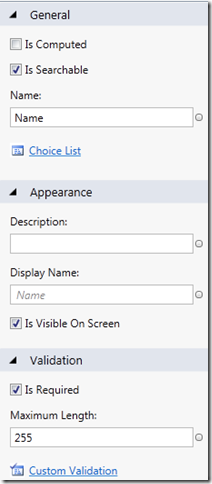 从上图,可以看到,Id字段是默认就有的,无法修改名称,但可以添加描述,并选择是否要显示在操作界面(Screen)上。这里有个问题,连Id的数据类型都不能修改,只能是Int32,而很多时候我更习惯使用Guid。希望正式版中可以给Id字段选择不同的数据类型(至少可以支持GUID)。