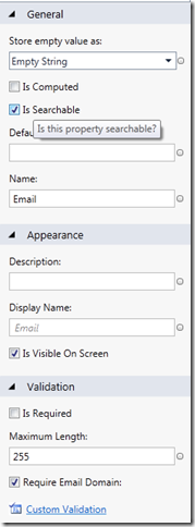 可以添加数据类型的为EmailAddress的字段,对于这点显得非常方便,不过如果能自己扩展数据类型就好了,类似SharePoint那样。