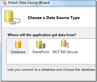 可以从数据库、SharePoint和WCF RIA Service中添加,奇怪的是数据库的选择可以通过other看到CE 3.5,不过我没有尝试,我只尝试了从SQL Server中导入一个表的操作: