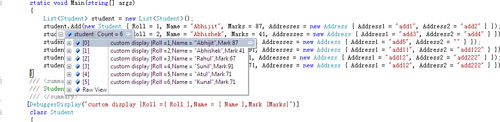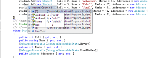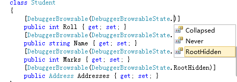 现在,我想要看到address的所有属性信息,隐藏Marks 属性。为了实现这样的需求,需要为给student 类中的Marks 和Addresses属性添加DebuggerBrowsable特性。如下图: