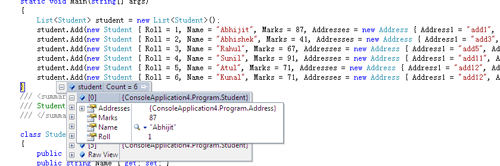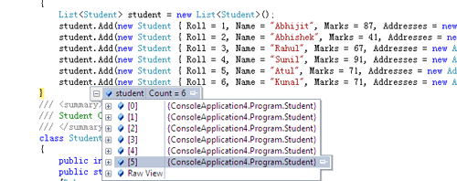 从上图中可以看到有6个student对象,每个对象的值都不同。Addresses是类Address的对象,它的调试信息值是隐藏的。