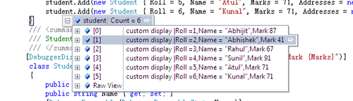 默认情况下,每一个study对象你只得到NameSpace.ClassName这样的显示信息。我们可以使用DebuggerDisplay来自定义显示的信息。 DebuggerDisplay 构造函数需要显示名作为参数。你可以传递指定参数来显示。做如下设置:
