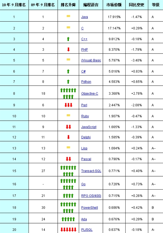 概述:Tiobe编程语言排行榜九月份榜单出炉,与上几个月的波动不同,本月的榜单相比上月并没有明显变化。在Top10中,上月位于第十位的Delphi被Ruby取代,跌至第12位。初次之外,Top10中各编程语言的排名没有变化。