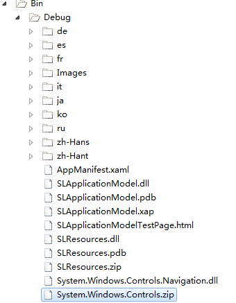 重新编译项目,选择显示所有文件然后打开Bin\Debug目录,会看到每一个缓存程序集都有自己的zip文件包。比如,如果使用了System.Windows.Controls.dll,会看到一个System.Windows.Controls.zip的文件,如图: