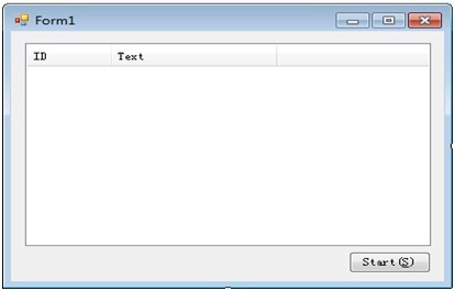 这次我们使用开发中出现频率极高的ListView控件,体验一次理想的”异步刷新”,窗体中有一个ListView控件命名为listView1,并将View设置为Detail,添加两个ColumnHeader;一个Button命名为btn_Start,设计视图如下: