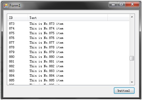 代码运行后,你将会看到一个飞速滚动的ListView列表,在加载的过程中,列表以令人眼花缭乱的速度添加数据,此时你尝试拉动滚动条,或者移动窗体,都会发现这次的效果与以往的”白板”、”假死”截然不同!这是一个令人欣喜的变化。