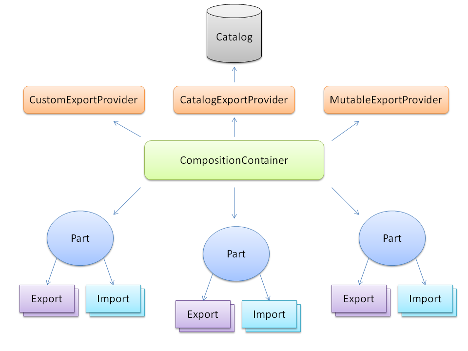 MEF的核心是可组合组件ComposablePart,它由ComposablePartDefintion来描述和创建。每一个可组合组件通过定义ExportDefintion向其它组件提供功能,通过ImportDefinition引用其它组件的功能,通过Metadata来描述组件自身的信息。在创建一个ComposablePart组件后,通过在组件目录(ComposableCatalog)搜索需要的功能实现组件组合。