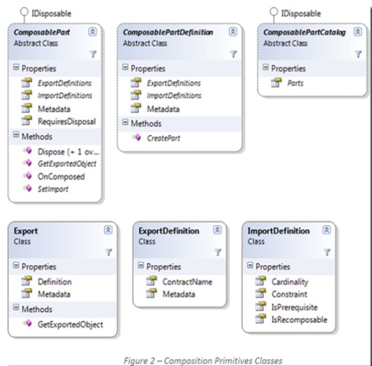 (1)ComposablePart:即可组合组件,是组合基元的核心类。ExportDefinitions表示该组件提供的功能的描述;而ImportDefinitions则是对引用其它组件功能的约束的描述。Metadata是对组件自身的特殊标识,当一个ComposablePart通过Import引用其它组件功能时,元数据可能作为满足引用功能的约束的一个条件。