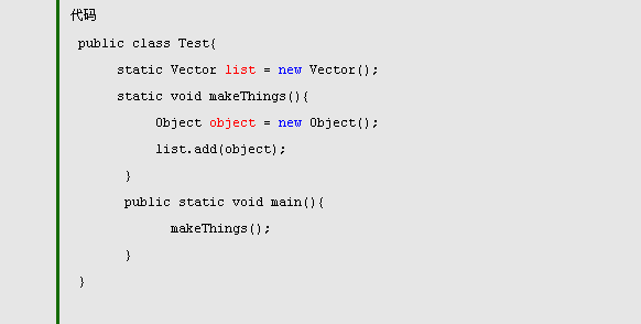 就拿上面的例子来说,放在栈内存中的有:main,makeThings,放在堆内存中有:Test,list,object。