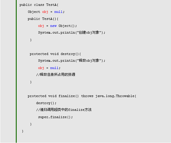 finalize方法最终是由JVM中的垃圾回收器调用的,由于垃圾回收器调用finalize的时间是不确定或者不及时的,调用时机对我们来说是不可控的,因此我们可以在自己的类中声明一个destory()方法,在这个方法中添加释放系统资源的处理代码,但是还是建议你将对destroy()方法的调用放入当前类的finalize()方法体中,因为这样做更保险,更安全。