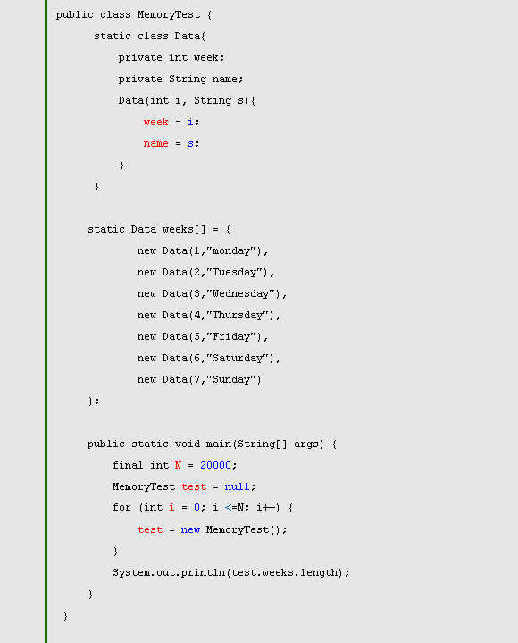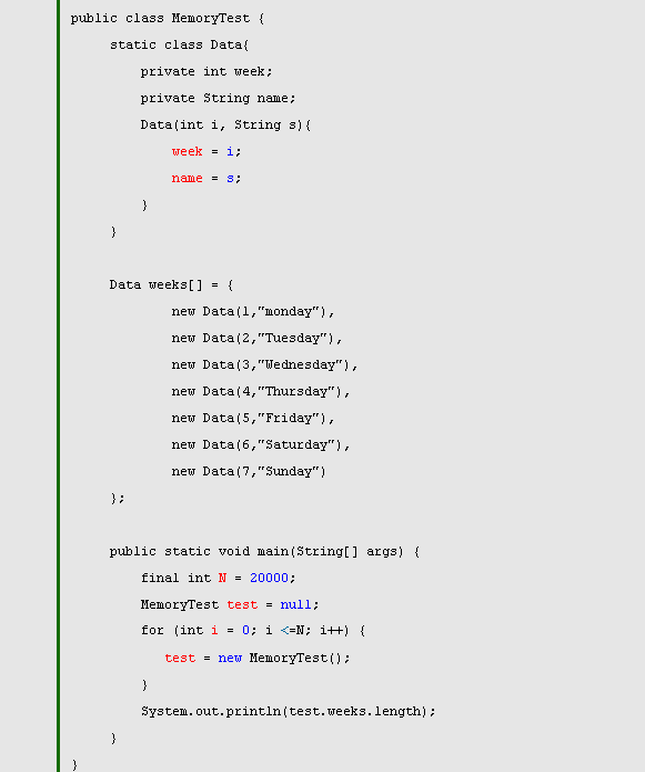 代码一会在内存中保存20000个weeks的副本,而代码二则在内存中保存1个weeks的副本,然后共享该副本,这样的话就不会造成内存的浪费。