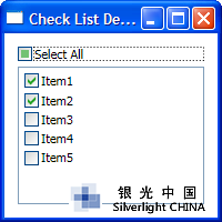 实际项目中常常要实现有CheckBox列表框。但是WPF没有自带这样的一个控件,下面就用Style来实现这样的功能。而对于CheckBox列表框,又常常会有一个Select All的CheckBox来表示当前列表框的选择状态。这个功能也会被包含在下面的示例之中。效果如下图所示。