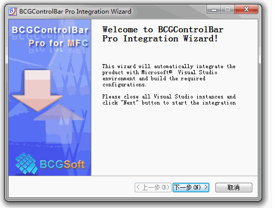 首先从网上下载BCGControlBar v12资源 ,解压之后在文件夹里面有个BCGCBProIntegrationWizard.exe 的文件,双击执行(如果执行不了,双击注册表文件reg,导入注册表,可能要根据需要更改)。出现如下图所示,按图释下一步即可。完成:
