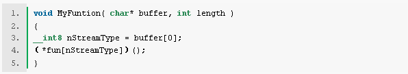 只要2行代码,就完成了256条case语句要做的事,减少了编写代码时工作量,将nStreamType作为数组下标,直接调用函数指针,从代码执行效率上来说,也比case语句高。假如多个函数中均要作如此处理,函数指针数组更能体现出它的优势。