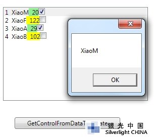效果图: 当选中第一项,然后单击"GetControlFromDataTemplate"按钮,则弹出第一项中控件的内容XiaoM。