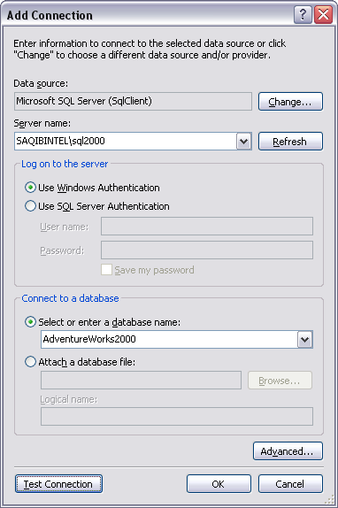 创建一个新的数据库连接,又或者从下了列表中选择一个已经创建的数据库连接。果您正创建一个新的连接,请给你的数据库服务器命名和设置身份验证信息,并选择“AdventureWorks”作为你的数据库。请确保如果你按“测试连接”按钮,你会得到一个“测试连接成功”的消息。