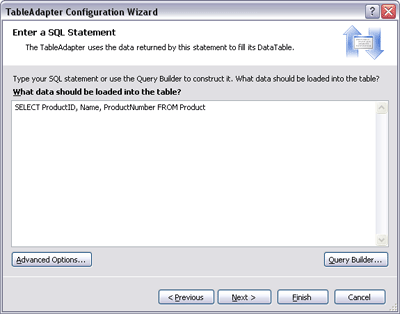 选择数据连接后,进行下一步。在“选择命令类型”屏幕中,选择“使用SQL语句”,然后点击“下一步”。在“Enter a SQL Statement”框中输入下列查询:SELECT ProductID, Name, ProductNumber FROM Product