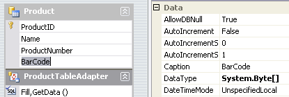 将该列命名为“BarCode”,并将此列的数据类型设置为 System.Byte[]. 下列列表中不包含此数据类型,因此,你需要像下图所示一样将数据类型输入进去。