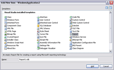 接下来,在解决方案资源管理器中右键单击项目,选择添加一个New Item,便可将一个新的报表添加到项目中。从模板对话框中选择“Report”。