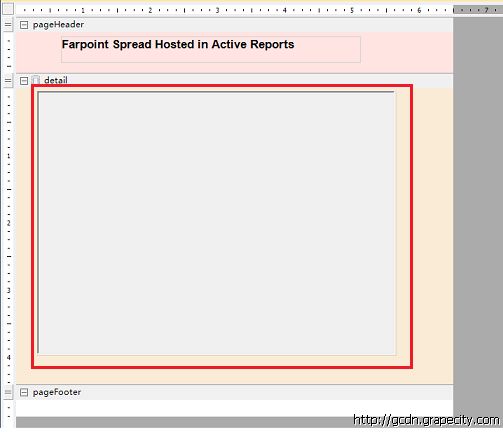 1. 为了美观,我们对NewActiveReport做了一些加工,这里不详细介绍。从工具箱中拖拽 Spread 到 NewActiveReport实例中,Spread 对象会作为一个自定义控件添加到报表中,ActiveReports 把 Spread 当作自定义控件,所以目前 Spread 为灰色。(红色矩形内部即为 Spread )