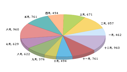 上面的图形是一个柱形图,如果我们想用同样的数据,以饼图来展示,我们只需要将Chart.html代码中的“FusionCharts_Column3D.swf”改成饼图的SWF文件就可以了,即“FusionCharts_Pie3D.swf”。现在我们再刷新浏览器,看看效果: