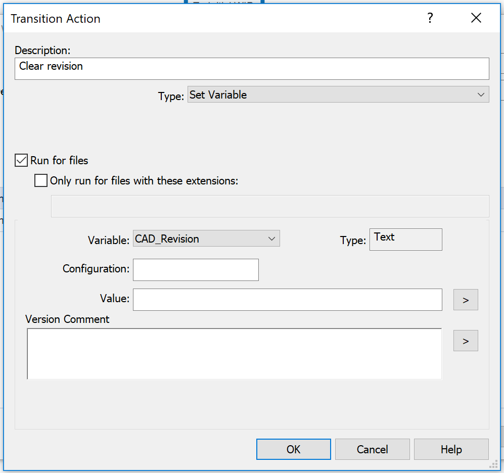 当文件从“初始WIP”转换为“初始WIP”时,“至初始WIP”转换中的转换动作可用于清除或将修订变量设置为null: