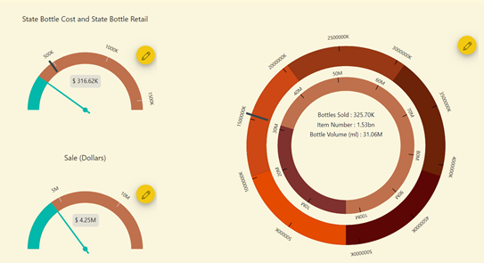 可视化工具使您可以轻松地将实际值(例如关键业务指标)与目标值进行比较。此视觉效果有很多自定义和配置选项。Gauge可以是完整或半圆,并具有在同一量规中显示两个不同指标的附加功能。其他配置包括: