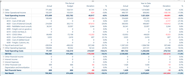 Profitbase visual的《财务报告矩阵》旨在轻松构建财务报告。视觉效果是一个矩阵,其中包含您希望在财务报告中使用的许多格式选项。此视觉效果的一些功能包括: