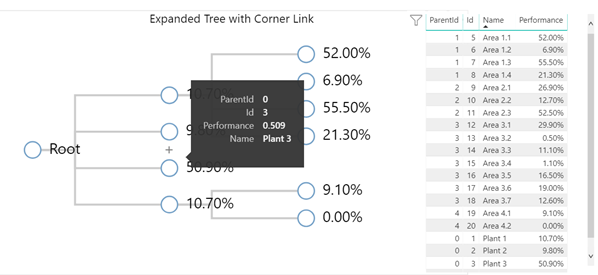 CK Corporation的Tree visual允许以易于使用的树状结构显示分层数据。 您需要做的就是为视觉对象提供一个父ID和一个子ID,它将自动找出树的结构。如果树有多个级别,您可以通过将鼠标悬停在节点上并单击加号图标来展开节点。您还可以使用各种格式设置功能,例如: