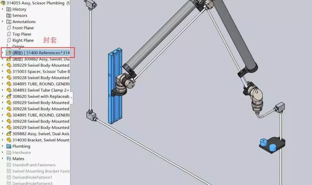 打开子装配,显示封套零部件。可以完成装配、参考设计等。封套零部件不影响装配的BOM表格信息。当顶层装配体发生更改时,发布的封套零部件会承继更改。