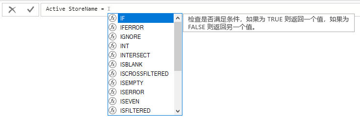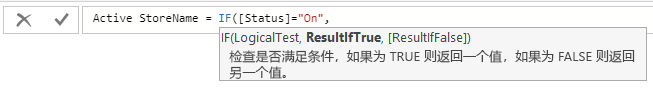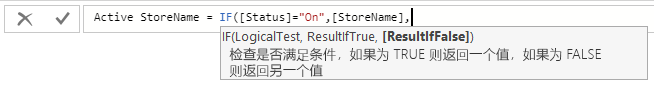 “商店”表中有一个名为“状态”的列,其中值“开”用于活跃商店,而“关”则用于非活跃商店,我们可以使用该列创建新Active StoreName列的值。DAX公式将使用逻辑IF函数来测试每个商店的状态,并根据结果返回特定值。如果商店状态为“开”,公式将返回商店名称。如果为“关”,则公式将分配“非活跃”Active StoreName。