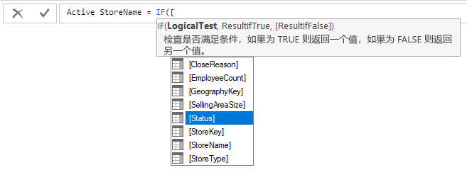 3、IF第一个参数是商店状态是否为“开”的逻辑测试。键入一个左括号[ ,它会从“商店”表中列出列,然后选择[Status] 。