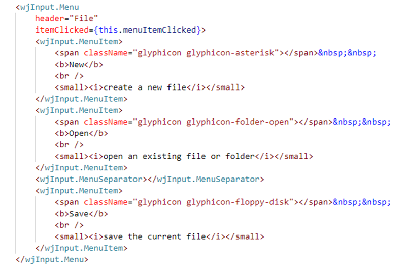 通过WijmoJS,您可以使用组件的方式快速定义菜单项:在渲染函数的JSX标记中使用嵌套到其Menu部分的MenuItem组件,而不用在数组中定义项目,其中每个MenuItem可定义一个单独的菜单项,其内容具有任意复杂性。