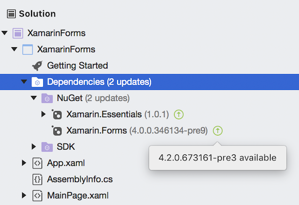 △ Visual Studio for Mac中“解决方案”窗口中的NuGet包更新