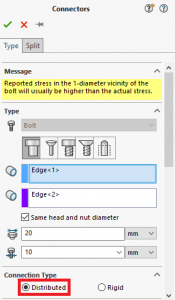 这是螺栓连接器的新PropertyManager,显示了 “ 连接类型”的“ 分布” 和“ 刚性”选项 :