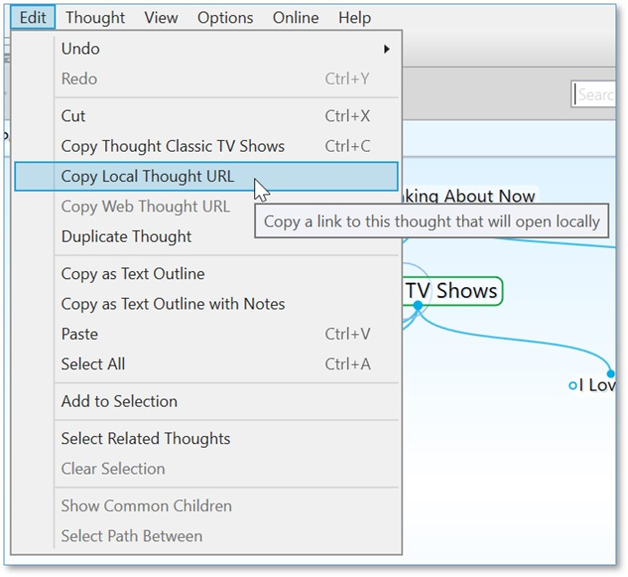 右键单击“Thought”(或单击“Edit”菜单),然后单击Copy Local Thought URL。
