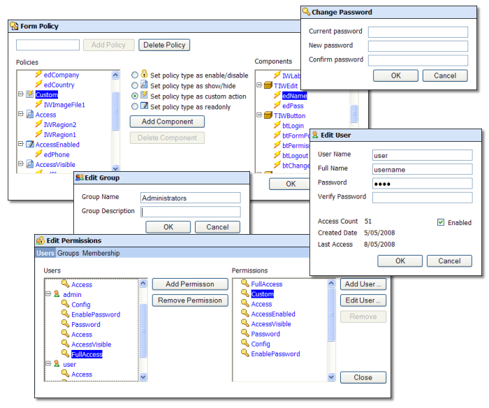 The TMS Security System facilitates the definition of user rights on a menu or form level. In its user management features the TMS IntraWeb Security System relies on user/group profiles stored in a database.
