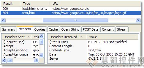 在HttpWatch选择一个请求和所有你需要知道的信息会显示在选项卡式的窗口。Cookies、Headers、Query Strings和POST数据可以被快速查看、搜索和导出到其他格式。