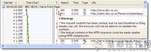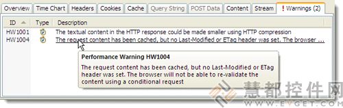 当一个HTTP请求或资源下载的速度可以改善时,性能警告就会显示。警告包括的信息有web服务器应该如何配置以避免这个问题。