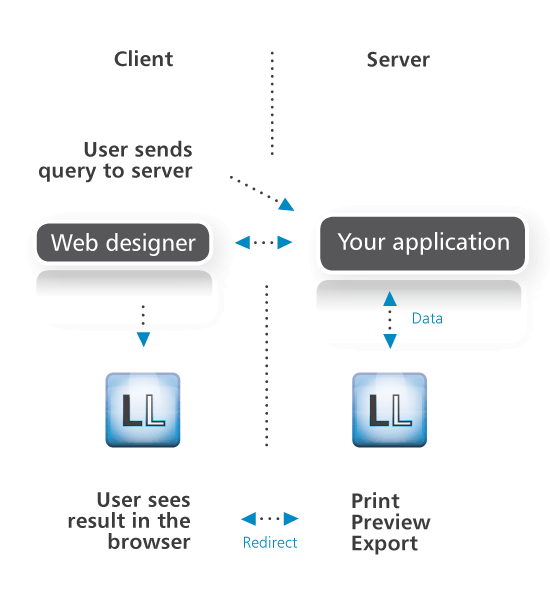 | 传统桌面应用程序:: 数据库(用户的应用程序将数据传送至List & Label)或者通过.NET, Delphi, C++ Builder完成数据绑定. ![]() | 服务器或者Web服务器应用程序: 用户仅需在起Web应用程序中计划设置一个接口以创建报表。在企业版中我们提供了为服务器和web服务器应用程序定制的无限制运行时授权! ![]() |