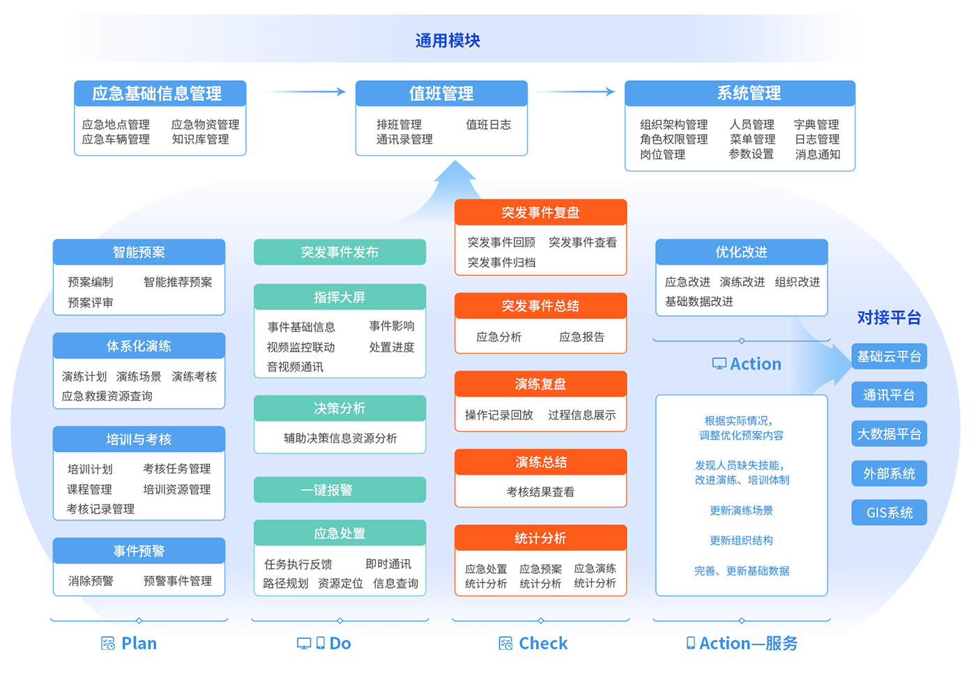 慧都应急管指挥调度系统实现平战结合,平时能够进行培训、演练,应急事件发生后, 能够通过可视化面板,迅速掌握事故信息。通过移动端、桌面端的实时互联,快速进行指挥部署, 让应急救援工作从传统救援跨越成为信息时代的智慧救援。为企业应急救援提供新思路、新模式, 通过该系统可实现: